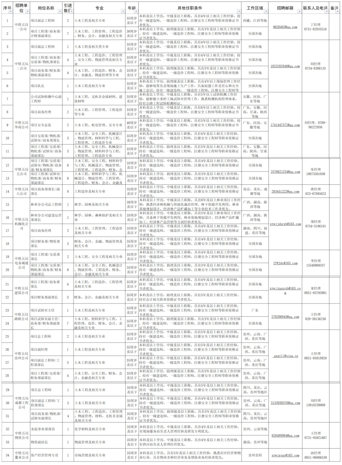 中鐵五局所屬子分公司公開招聘崗位。