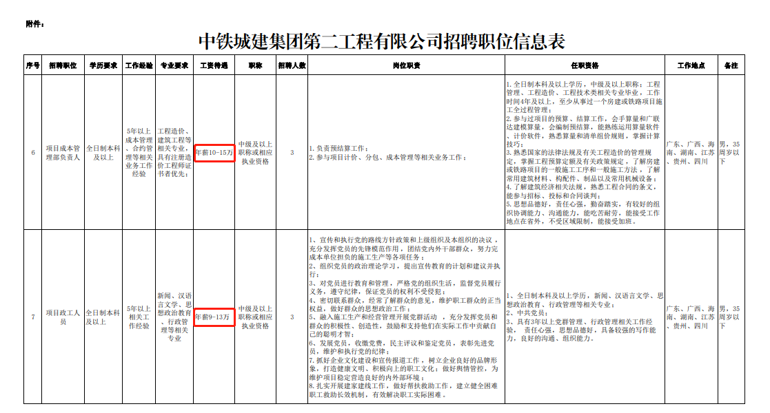 本次招聘崗位為中鐵城建二公司所屬項目部專業技術人員和管理人員。招聘崗位情況如下: