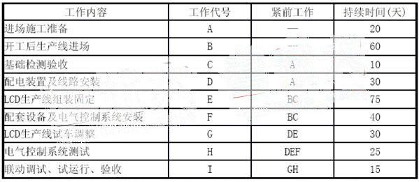 2006(二)南方電子電氣有限公司(建設(shè)單位)新建液晶屏(LCD)生產(chǎn)車間,其生產(chǎn)線由建設(shè)單位從國外訂購,A 施工單位承包安裝。A 施工單位進場時,生產(chǎn)車間的土建工程和機電配套工程(B 施工單位承建)已基本完工。A 施工單位按合同工期要求,與建設(shè)單位、生產(chǎn)線供應(yīng)商和B施工單位洽談,編制了LCD 生產(chǎn)線安裝網(wǎng)絡(luò)計劃工作的邏輯關(guān)系及工作持續(xù)時間表(見下表)。LCD 生產(chǎn)線安裝網(wǎng)絡(luò)計劃工作邏輯關(guān)系及持續(xù)時間表