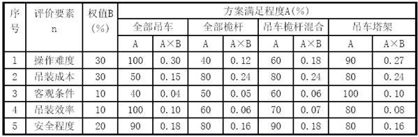 1.根據(jù)技術(shù)經(jīng)濟分析表,運用綜合評價法選定最優(yōu)的吊裝方案。