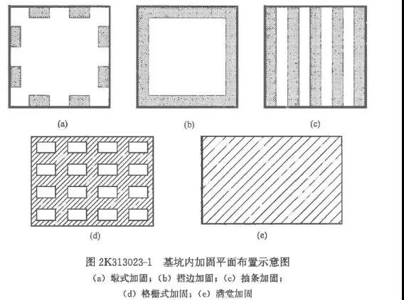 (2) 采用水泥土攪拌、高壓噴射注漿、注漿或其他方法對地基摻人一定量的同化劑或使土體固結,以提高土體的強度和土體的側向抗力為主,適用于深基坑?;觾缺粍訁^加固形式主要有墩式加固、裙邊加固、抽條加固、格柵式加固和滿堂加固。