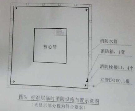 “在建工程施工防火技術(shù)方案”中,對(duì)已完成結(jié)構(gòu)施工樓層的消防設(shè)施平面布置設(shè)計(jì)見(jiàn)圖5。圖中立管設(shè)計(jì)參數(shù)為:消防用水量15L/s,水流速ⅰ=15m/s;消防箱包括消防水槍、水帶與軟管。監(jiān)理工程師按照《建筑工程施工現(xiàn)場(chǎng)消防安全技術(shù)規(guī)范》(GB50720-2011)提出了整改要求。