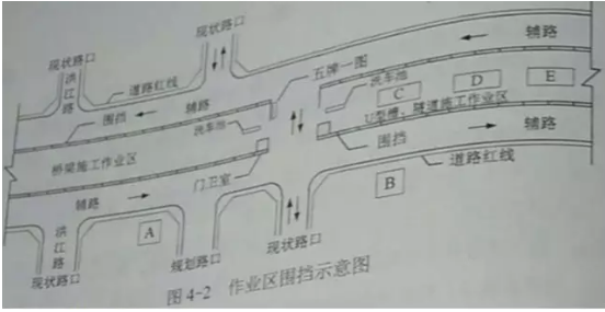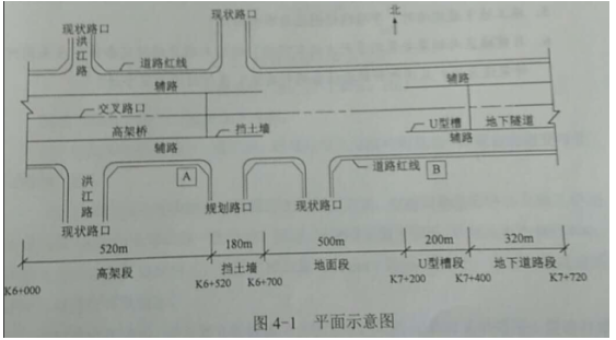 背景資料某市區城市主干道改擴建工程,標段總長1.72km,周邊有多處永久建筑,臨時用地極少,環境保護要求高;現狀道路交通量大,施工時現狀交通不斷行。本標段是在原城市主干路主路范圍進行高架橋段-地面段-入地段改擴建,包括高架橋段、地面段、U型槽段和地下隧道段。各工種施工作業區設在圍擋內,臨時用電變壓器可安放于圖4-1中A、B位置,電纜敷設方式待定。