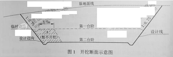 某施工單位承接了某丘陵區一級公路路基施工任務。施工單位編制了路基施工組織設計,并對施工組織設計進行了優化,重點優化了施工方案,主要包括施工方法的優化、施工作業組織形式的優化、施工勞動組織的優化。技術人員根據路基橫斷面計算出土石方的“斷面方數”, 經復核后,進行土石方縱向調配。調配時考慮到技術經濟條件,盡量在經濟合理的范圍內移挖作填,使路塹和路堤中土石方數量達到平衡,減少了棄方與惜方。全標段路基挖方土質為普通土,平均運距50m的土方有150000m³,平均運距200m的土方有100000m³,平均運距3000m的土方有80000m³ K5+630~K5+810的平均挖方深度7m左右,施工單位采用的某一開挖斷面示意如圖1,要求上下錯臺同時掘進。