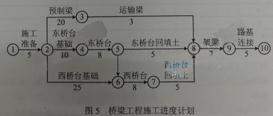 在工程開工前,施工單位向監理單位提交了橋梁施工進度計劃,如圖5所示(單位:天),監理工程師批準了該計劃。