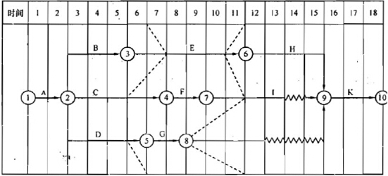 事件二:針對(duì)某分部工程,施工單位編制如下進(jìn)度計(jì)劃時(shí)標(biāo)網(wǎng)絡(luò)圖,并在第 6 個(gè)月底和第11 個(gè)月底對(duì)實(shí)際進(jìn)度進(jìn)行檢查,繪制進(jìn)度計(jì)劃前鋒線如下圖(單位:月)。