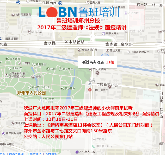 上課地址:【新橋商務(wù)酒店11樓會(huì)議室】鄭州市金水路與二七路交叉口向南150米路東(人民公園東門(mén)斜對(duì)面)