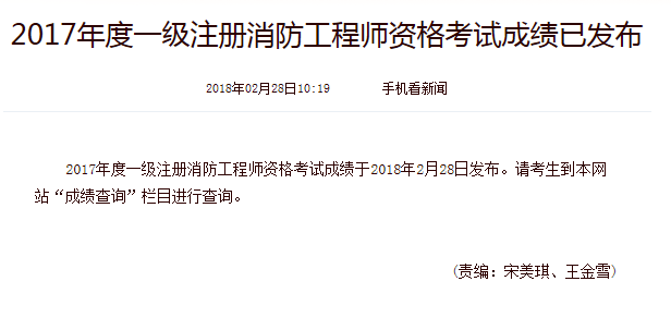 2017年度一級注冊消防工程師資格考試成績已發布,請各位報考2017年度一級注冊消防工程師的考試們登錄中國人事考試網(http://www.cpta.com.cn/)”成績查詢“欄查詢!