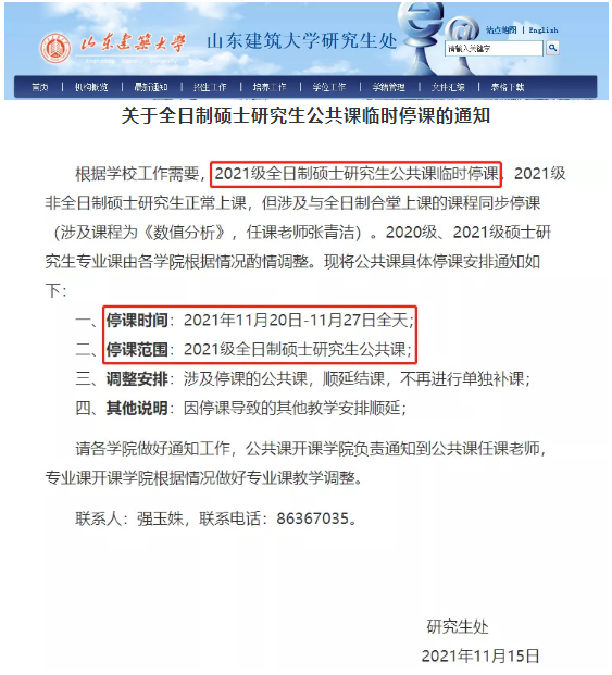 2020年11月6日,山東建筑大學(xué)發(fā)布《關(guān)于研究生公共課臨時(shí)停課的通知》,其中停課時(shí)間:2020年11月20下午—11月27日全天。