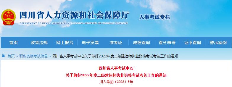 根據四川省人力資源和社會保障廳《關于印發四川省2022年度專業技術人員資格考試工作計劃的通知》(川人社廳辦發〔2022〕10號)、四川省人力資源和社會保障廳《關于做好我省專業技術人員資格考試告知承諾制有關工作的通知》(川人社辦發〔2020〕14號)以及四川省人力資源和社會保障廳、四川省住房和城鄉建設廳《關于做好我省二級建造師執業資格考試工作的通知》(川人社辦發〔2014〕4號)等文件精神,為切實做好我省2022年度二級建造師執業資格考試考務工作,現將有關事項通知如下: