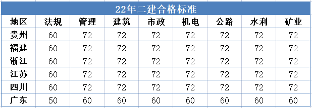 目前,已經有6地公布22年二建合格標準,大多為試卷滿分的60%,廣東省較低,為試卷滿分的50%。