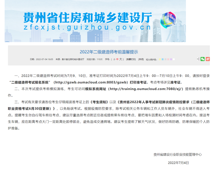 昨日,貴州省住房和城鄉建設廳發布2022年二級建造師考前溫馨提示,7月4日準考證開始打印。