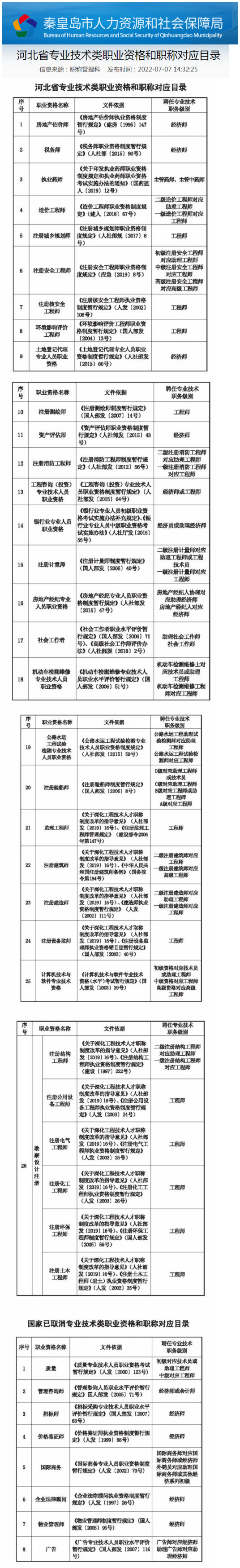 秦皇島人社局公布《河北省專業技術類職業資格和職稱對應目錄》,序號第23號明確一級建造師對應工程師。