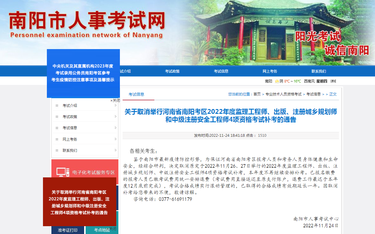 南陽(yáng):取消2022年注安、監(jiān)理等4項(xiàng)考試補(bǔ)考!