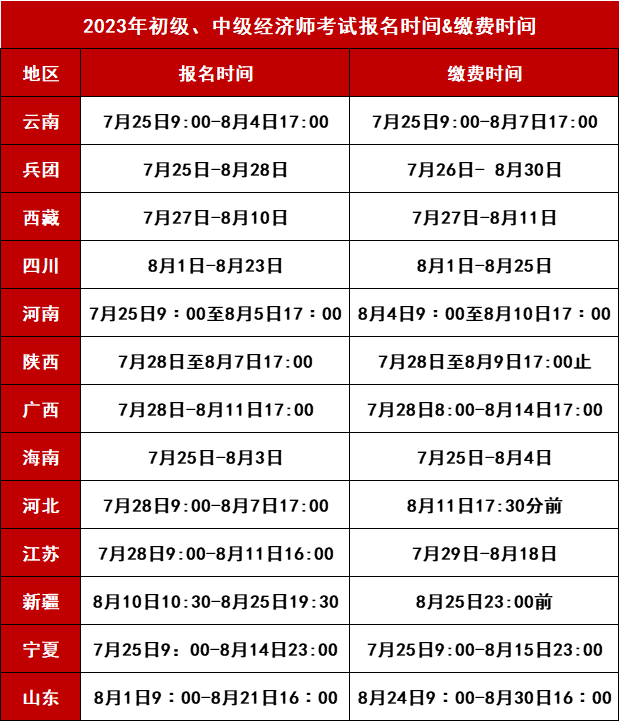 截止今日,共有13個(gè)地區(qū)發(fā)布了2023年初、中級(jí)經(jīng)濟(jì)師報(bào)考通知,明確了經(jīng)濟(jì)師的報(bào)名時(shí)間及各項(xiàng)要求。這13個(gè)地區(qū)分別是廣西、四川、海南、云南、西藏、兵團(tuán)、江蘇、河北、新疆、寧夏、山東、河南、陜西。具體的報(bào)名時(shí)間安排和繳費(fèi)時(shí)間如下圖所示:
