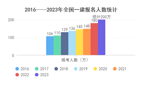 從2019年以后,全國每年大約有150萬人報考一級建造師考試,而且近年報考人數(shù)一直呈現(xiàn)出增長趨勢。22年報名人數(shù)約180萬,今年考一建的人數(shù)陡增,預(yù)計能突破200萬人!