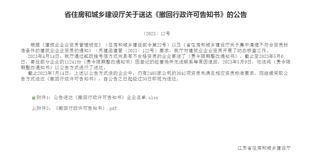 近日,江蘇省住建廳對建筑業(yè)企業(yè)資質(zhì)開展的動態(tài)核查工作: