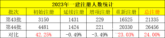 近日,住建部公布了2023年第四十四批一建注冊人員名單,本批次共26456人符合一級建造師注冊條件,相對于上一批,總增長24%,共5121人,具體如下: