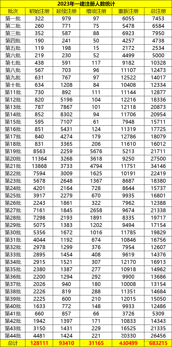 截止目前,住建部共公布了44批注冊數(shù)據(jù),2023年一級建造師注冊人數(shù)已達(dá)到683215萬人,具體如下: