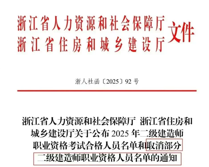 近日,浙江省人力資源和社會保障廳、浙江省住房和城鄉建設廳聯合發布《關于公布2025年二級建造師職業資格考試合格人員名單和取消部分二級建造師職業資格人員名單的通知》(浙人社函 [2025] 92號),明確對2022、2023、2024三個年度的189名二級建造師考生作出處理——取消考試成績、收回已發證書。