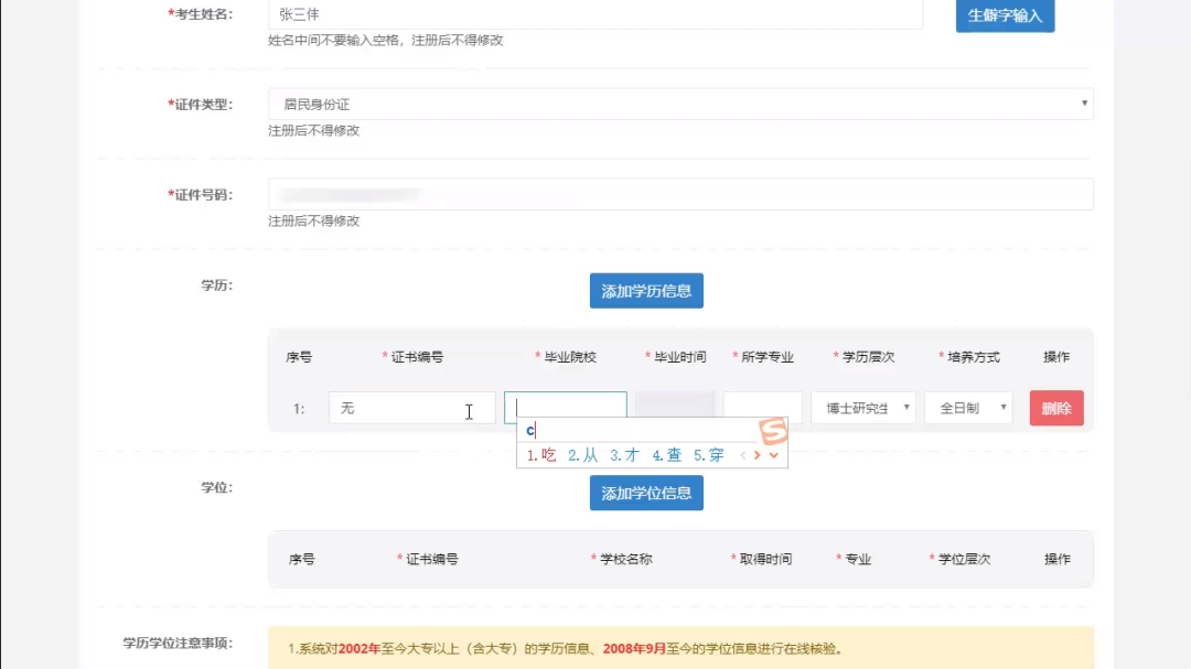 ②學歷上的身份證信息與注冊時所填寫的身份證信息必須一致。