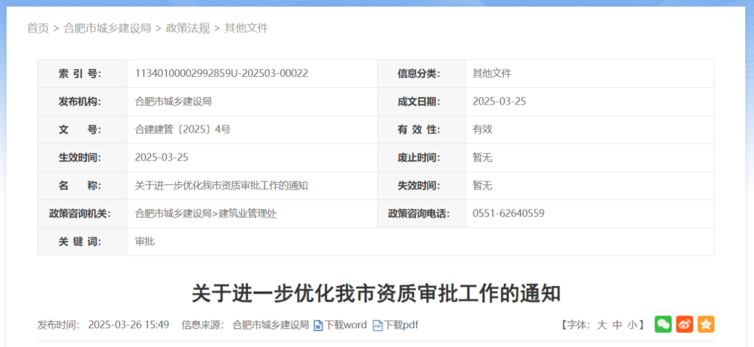 2025年3月,合肥市住建局發布《關于進一步優化我市資質審批工作的通知》(合建建管〔2025〕4號)