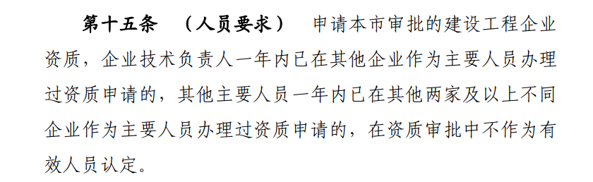 第十五條 (人員要求) 申請本市審批的建設工程企業資質,企業技術負責人一年內已在其他企業作為主要人員辦理過資質申請的,其他主要人員一年內已在其他兩家及以上不同企業作為主要人員辦理過資質申請的,在資質審批中不作為有效人員認定。