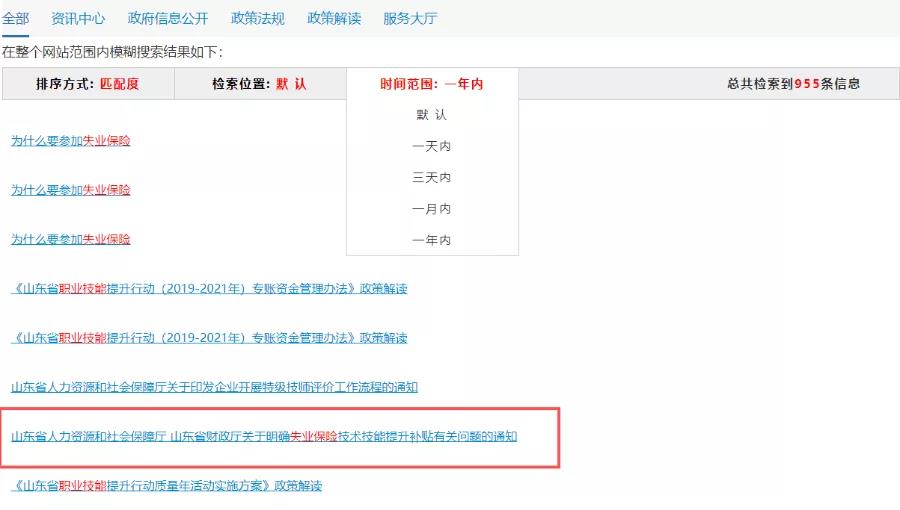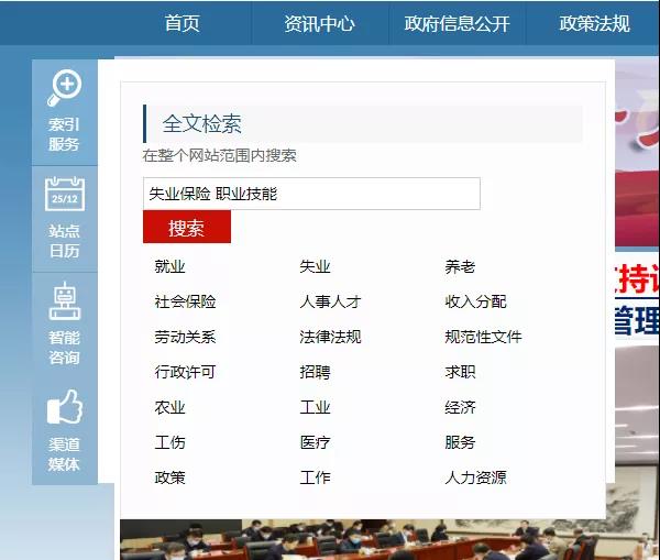 第二步,輸入失業保險、職業技能等關鍵詞進行搜索。