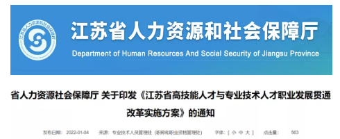 日前,江蘇省人社廳印發《江蘇省高技能人才與專業技術人才職業發展貫通改革實施方案》,本通知自印發之日起施行。