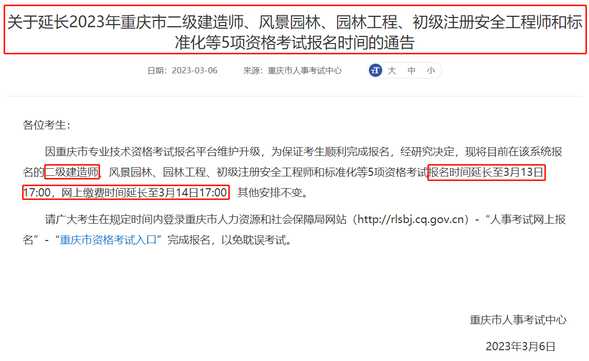 重慶市報名的二級建造師等5項資格考試報名時間延長至3月13日17:00,網上繳費時間延長至3月14日17:00,其他安排不變。