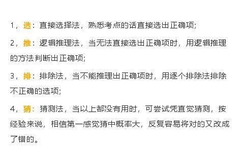 2,一定要選擇有把握的選項,在沒有絕對把握的情況下最好不選;若對所有選項都沒有把握時,可用猜測法選擇1項,千萬別空著不選。