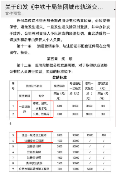 最近中鐵十局針對取得執(zhí)業(yè)資格證書的人員進行獎勵,其中一級建造師、注冊一級造價工程師、注冊安全工程師均在獎勵范圍內(nèi),獎勵如下: