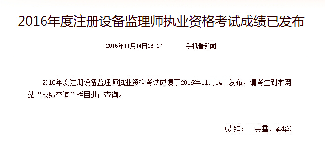 2016年度注冊(cè)設(shè)備監(jiān)理師執(zhí)業(yè)資格考試成績已發(fā)布,原文如下: