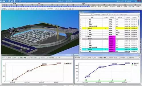 施工管理人員結合BIM在模型量化的基礎上,將三維模型與施工進度計劃連接,將空間信息與時間信息反映到模型中,實現對施工進度計劃的管控。管理人員可以通過劃分已經完成工程量,輸出施工進度,進行實際施工進度與計劃施工進度的對比;可以直接對現場進度情況進行分析診斷,更直觀、可視、清晰,改變了傳統的施工進度管理模式,確保了進度計劃合理和可行。
