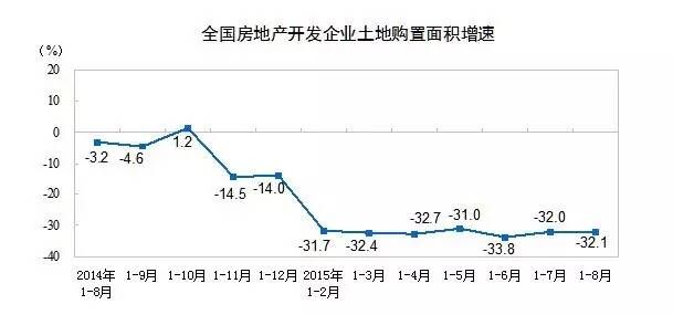 1-8月份,房地產開發企業土地購置面積14116萬平方米,同比下降32.1%,降幅比1-7月份擴大0.1個百分點;土地成交價款4294億元,下降24.6%,降幅收窄1個百分點。