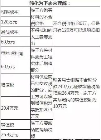 假定施工方除材料外每月其余費用為10萬元(無法取得增值稅專用發(fā)票,均無法做進項稅抵扣),那么施工方每月的進項稅額=20×17%=3.4萬元,施工方每月的銷項稅額=40×11%=4.4萬元,所以施工方每月應(yīng)繳納的增值稅額=4.4-3.4=1萬元。