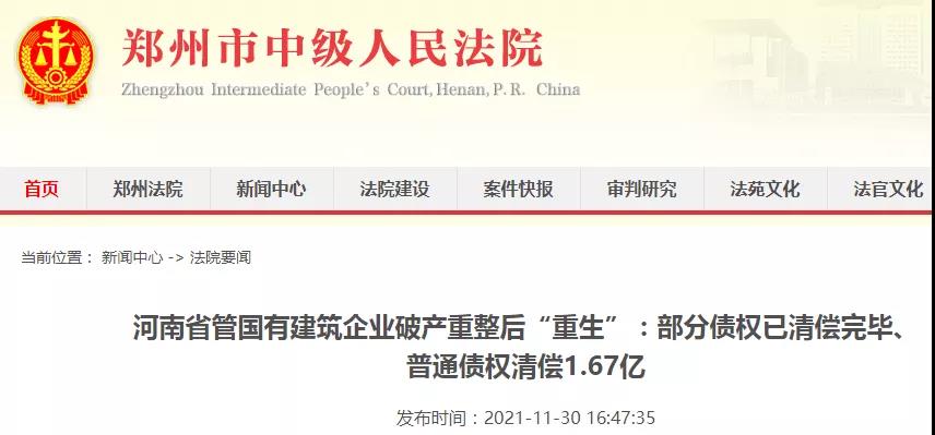 近日,鄭州市中級(jí)人民法院發(fā)布一則要聞。河南省管國(guó)有建筑企業(yè)破產(chǎn)重整后“重生”:部分債權(quán)已清償完畢、普通債權(quán)清償1.67億!