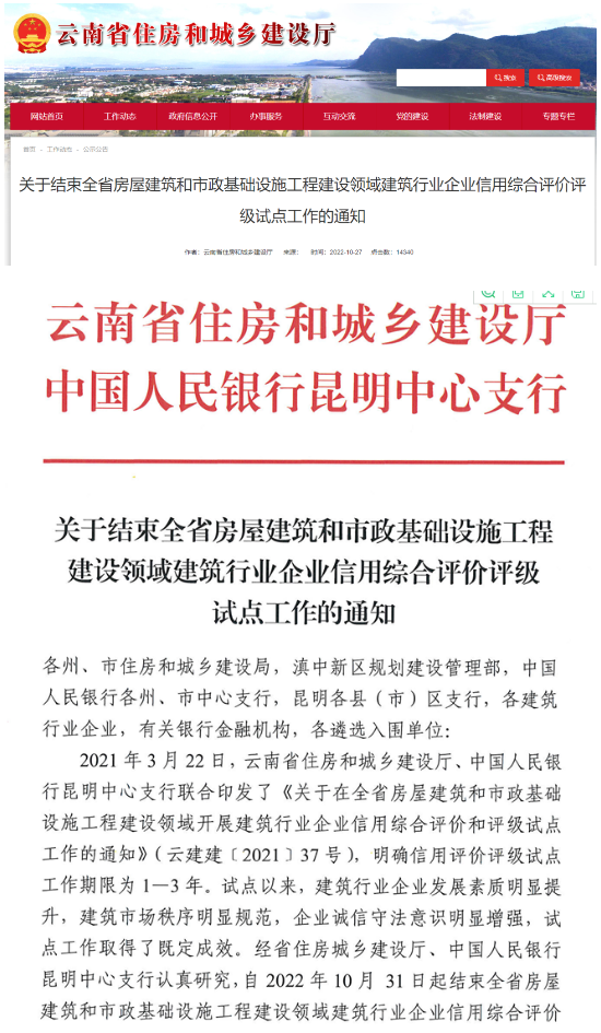 日前,云南省住建廳發布《關于結束全省房屋建筑和市政基礎設施工程建設領域建筑行業企業信用綜合評價評級試點工作的通知》
